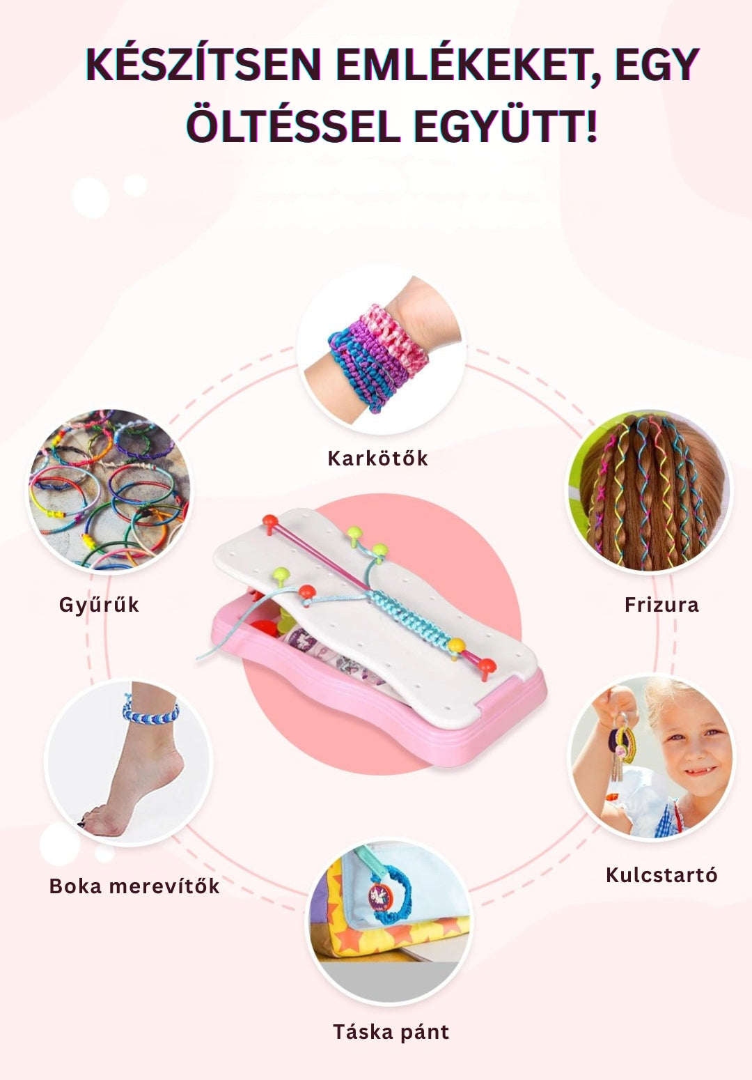 Színes változatosság és személyre szabás: A szálak, zsinórok, matricák és gombok széles választékával minden alkotás egyedi lehet. A gyerekek keverhetik és kombinálhatják a színeket, mintákat és medálokat, hogy tükrözzék saját stílusukat. A végtelen kombinációs lehetőségek miatt nincs két egyforma karkötő.
