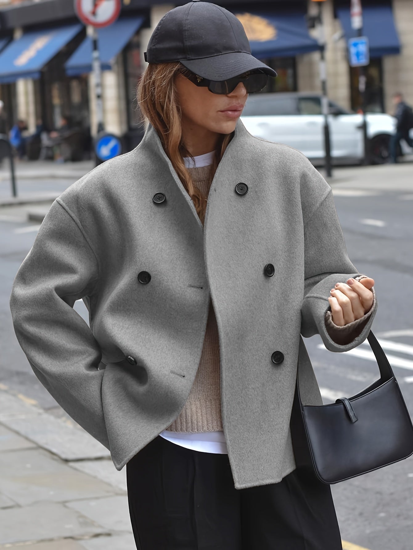 Kifinomult sziluett: A kétsoros gombolás zárás strukturált és időtálló megjelenést kölcsönöz, amely minden ruhát kiemeli. Kiegyensúlyozott szabása előnyös alakot kölcsönöz, amely alkalmas mindennapi és elegáns alkalmakra egyaránt. Ez teszi sokoldalú választássá, amely soha nem megy ki a divatból.