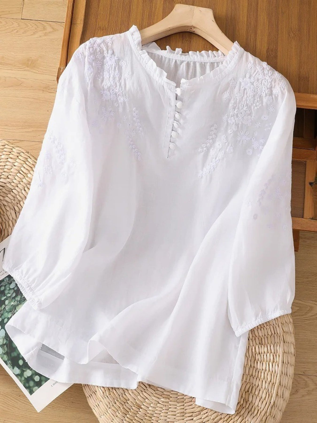 ✅Ráncos gallér: A nyakkivágás mentén finom ráncos szegély romantikus és időtlen elemeket kölcsönöz a darabnak. Finoman keretezi a gallér területét, anélkül, hogy túlzottan díszes vagy hivalkodó lenne. Ez a kis részlet fokozza a blúz eleganciáját és frissességét.