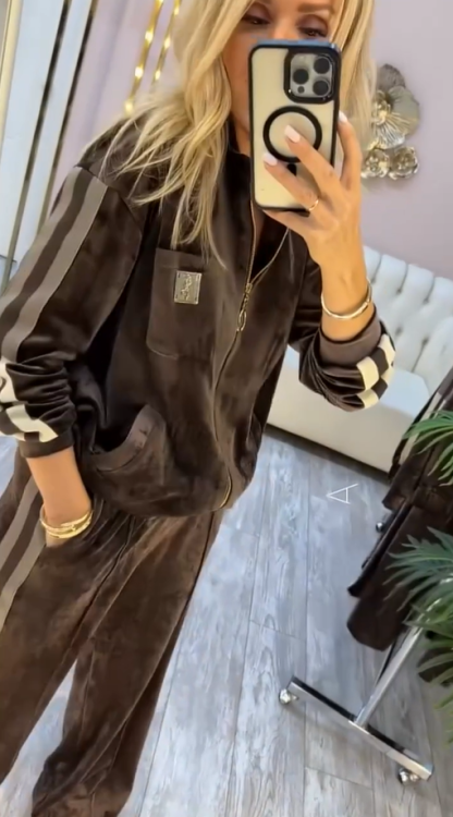 Csíkos díszítés: Az ujjakon végigfutó merész csík sportos, letisztult megjelenést kölcsönöz a szettnek. A tekintetet a karok mentén vezeti, éles, kiegyensúlyozott hatást keltve. Ez a kis részlet karaktert ad a ruhának, miközben könnyen viselhető marad. Kiemelkedő megjelenést kölcsönöz anélkül, hogy túl hivalkodó lenne.